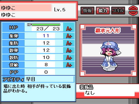 集弾と散弾はゆゆこから、俊敏はレミリアから継承され、他のステータスはランダムに決定されました。